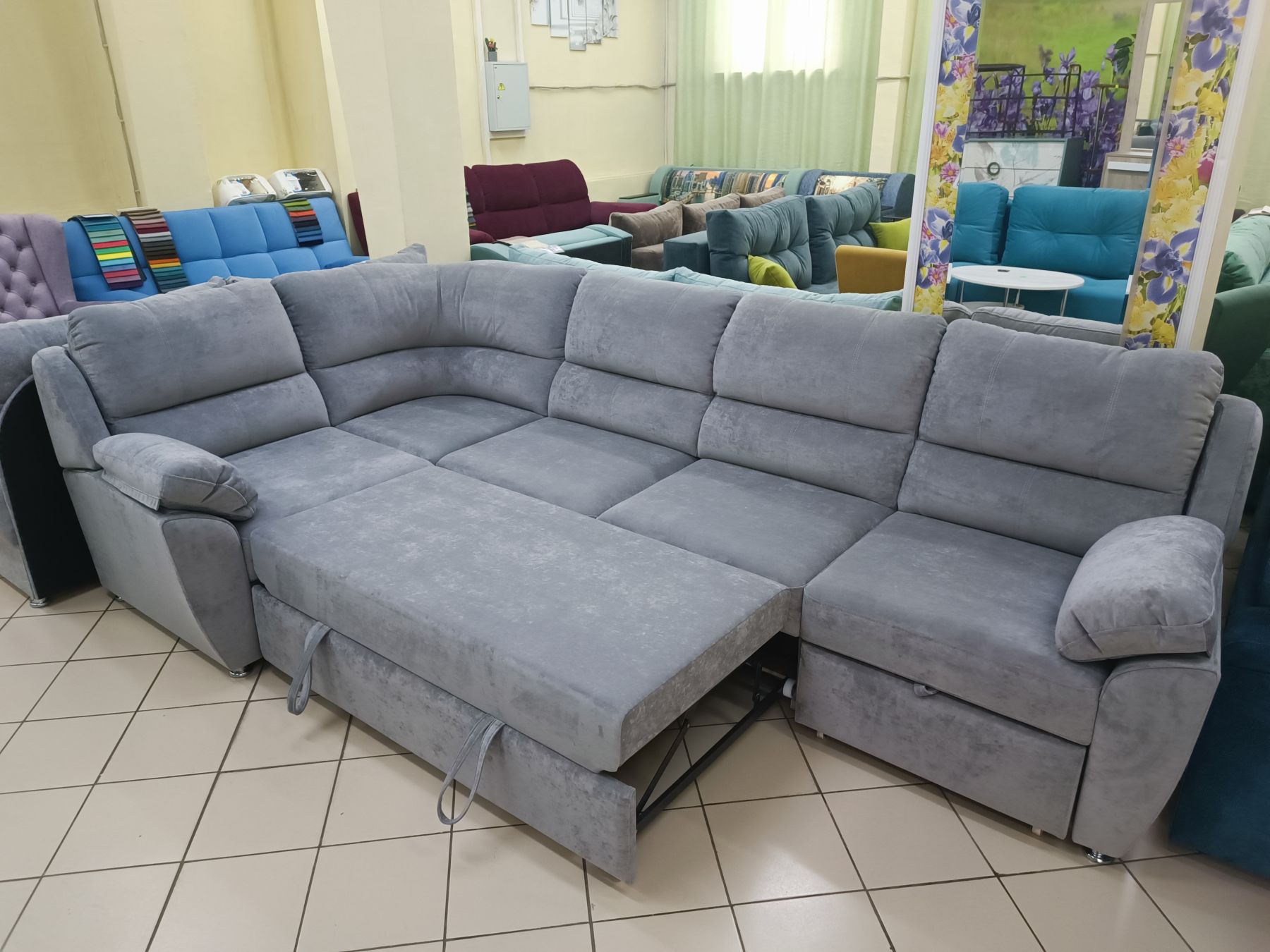 Общий габарит: 3200*1750 Спальное место: 2600*1300 Наполнение: фанера, блок пружин,пух, термовойлок, ППУ, мебельная ткань. Трансформация: дельфин. Так же изготовим под заказ, срок 14 дней.