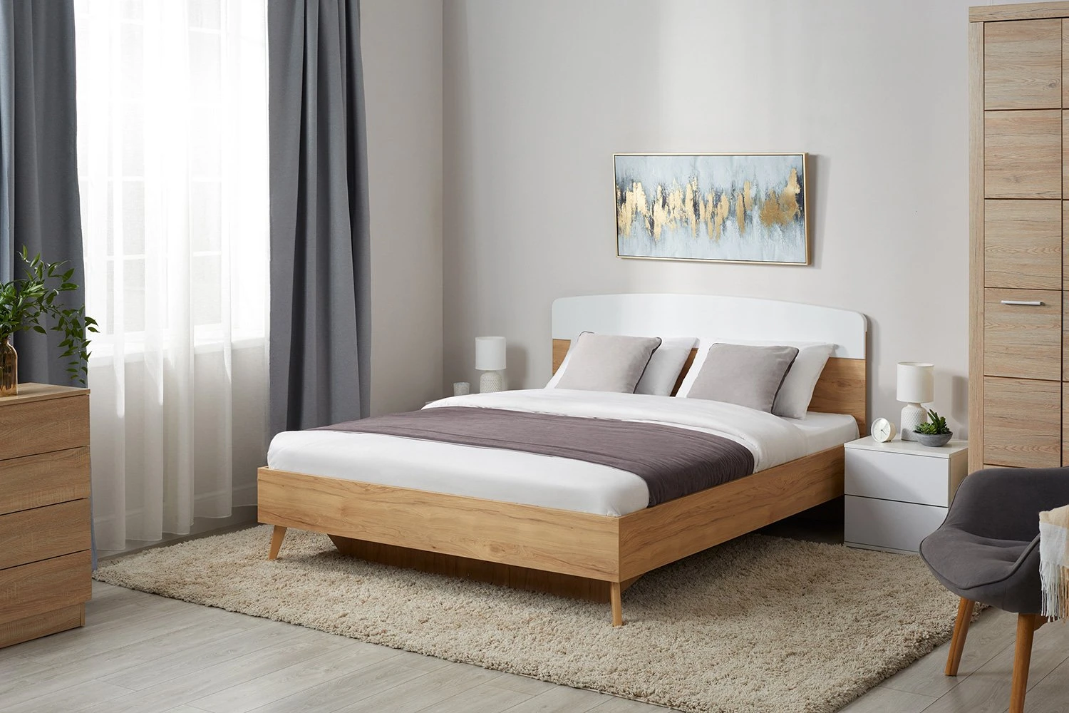 Изголовье МДФ цвета - Белый матовый, царги и изножье ЛДСП цвета - Дуб натуральный Светлый, опоры массив березы.