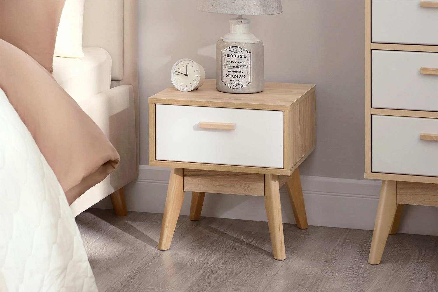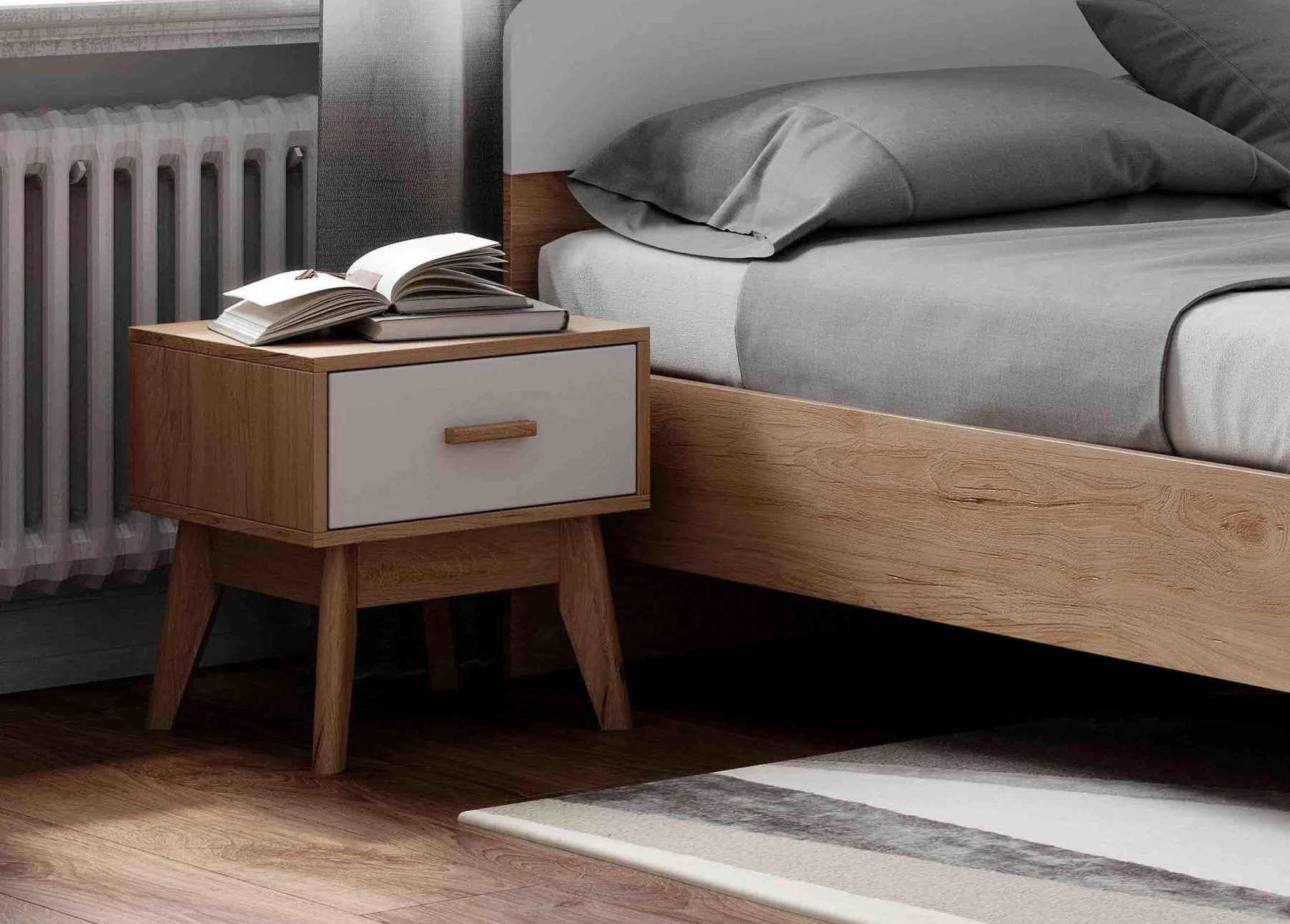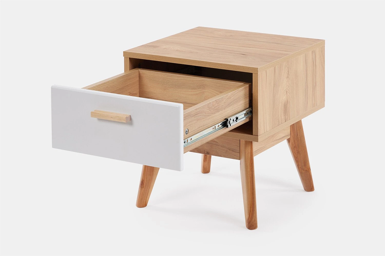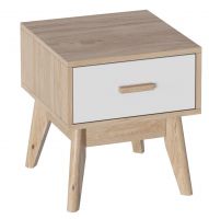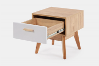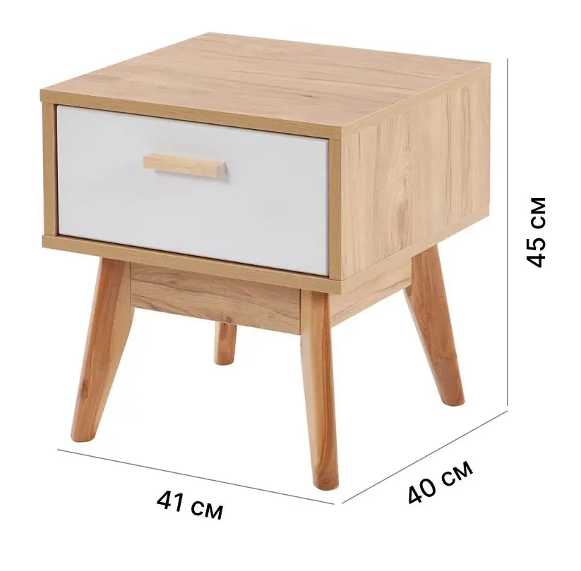 Размеры (ШхГхВ), мм: 410х400х450. Корпус ЛДСП (Дуб натуральный Светлый), фасад МДФ ( Белый Матовый). Опоры и ручка из массива березы.